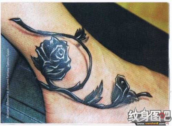 脚背上黑色的玫瑰花纹身图案