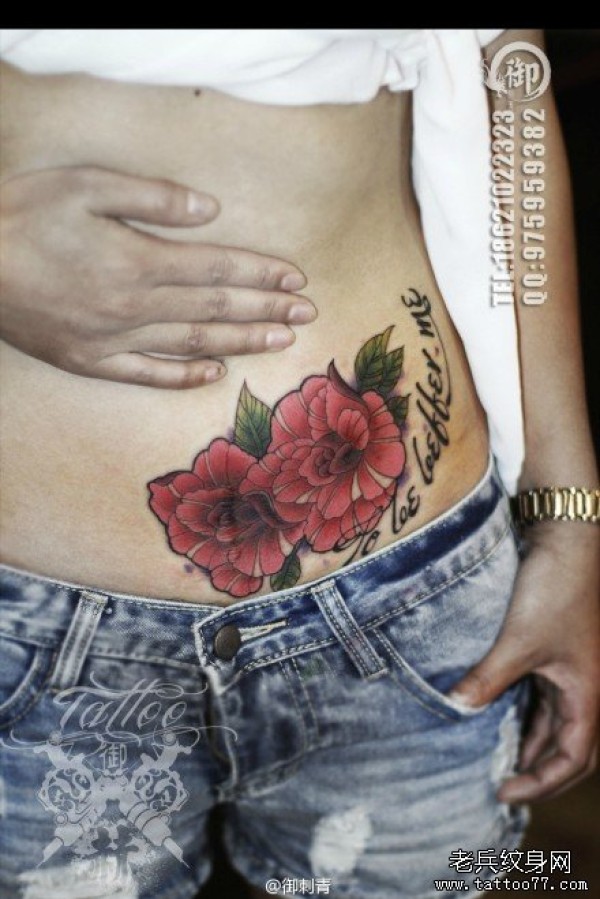 女生腹部彩色玫瑰花纹身图片