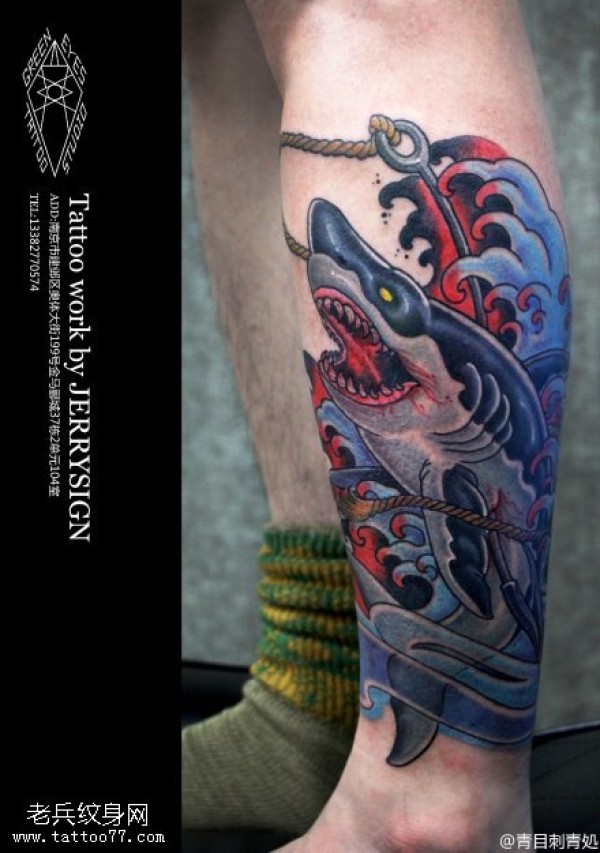 腿部彩色个性鲨鱼纹身图片