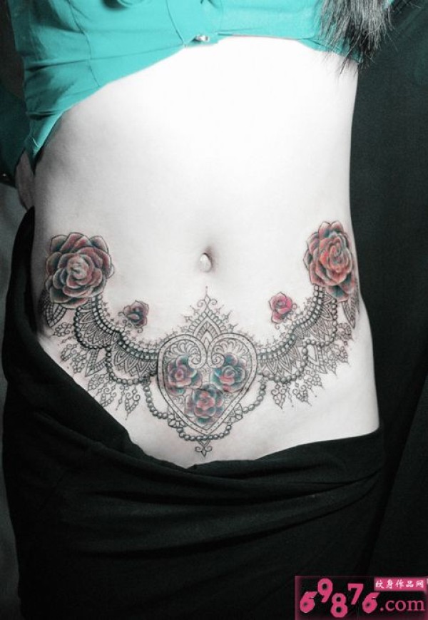 性感蕾丝玫瑰腹部个性纹身