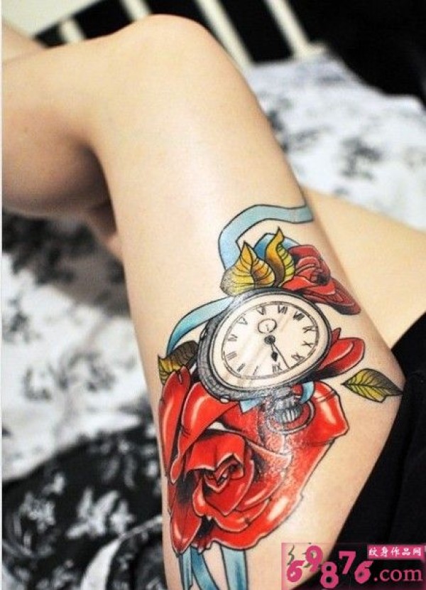 时尚女生腿部个性玫瑰时钟纹身图片