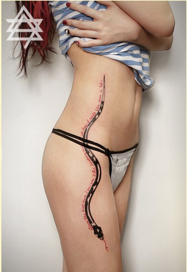 个性美女侧腰漂亮的图腾蛇字母纹身图