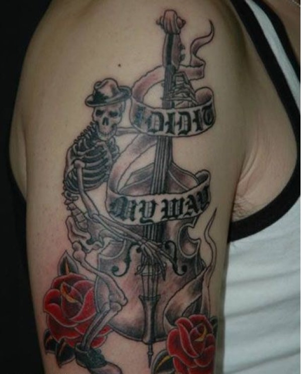 个性手臂时尚骷髅骨架吉他花纹身图片