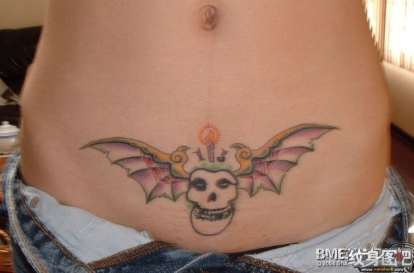 美女小腹部的长蝙蝠翅膀的可笑骷髅头纹身