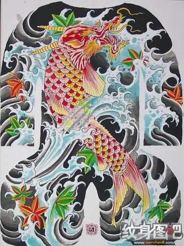 日式红色龙头鱼尾的动物纹身手稿