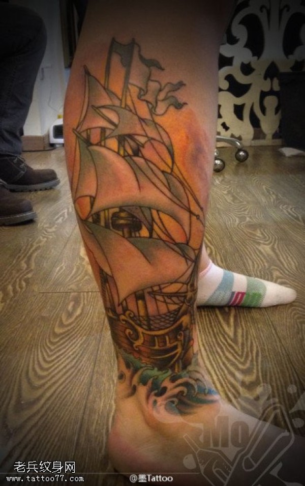 腿部个性帆船纹身图案