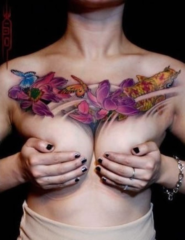 丰满胸部上的黄金鲤鱼纹身作品图片