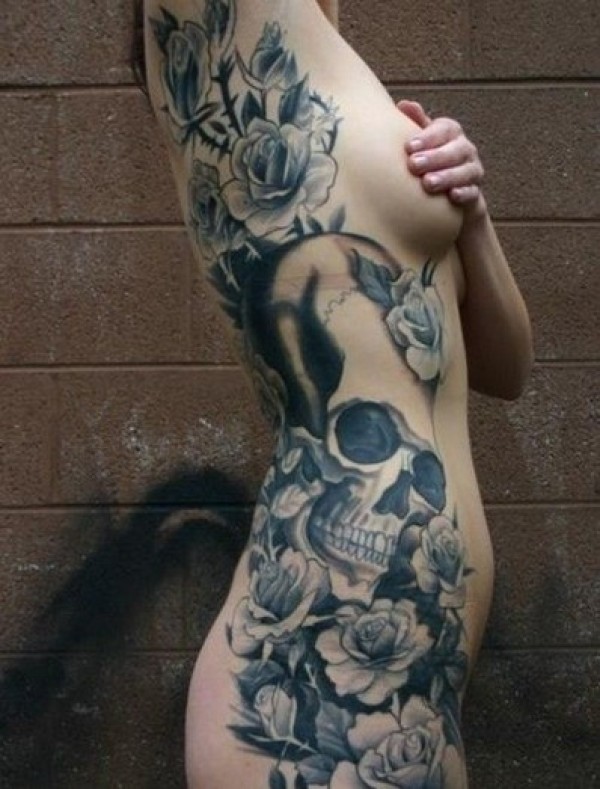 全裸女生侧腰漂亮骷髅花朵结合纹身图图片