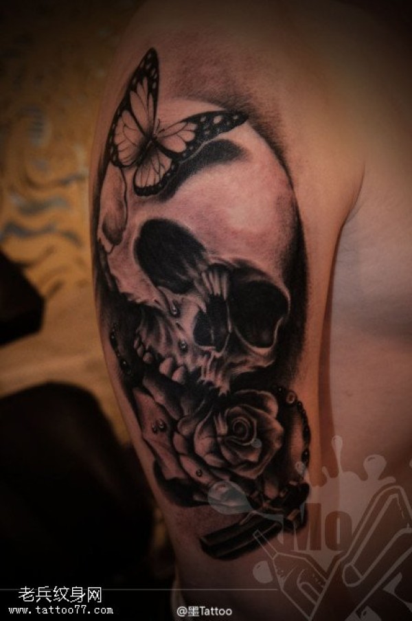 手臂黑灰骷髅玫瑰花蝴蝶纹身图案