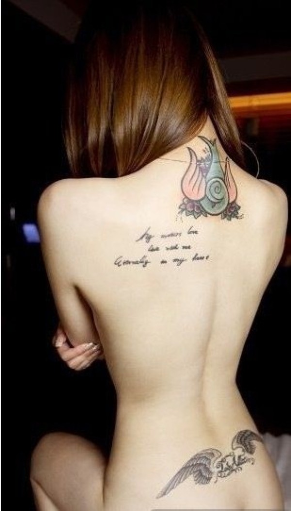美女背部文字图案纹身作品图片