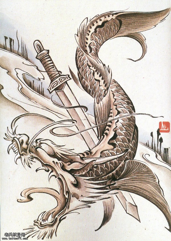 龙纹身手稿_一组老传统黑灰龙手稿纹身图案