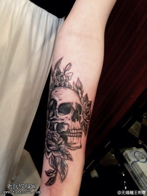 女生手臂经典潮流的骷髅与玫瑰花纹身图案