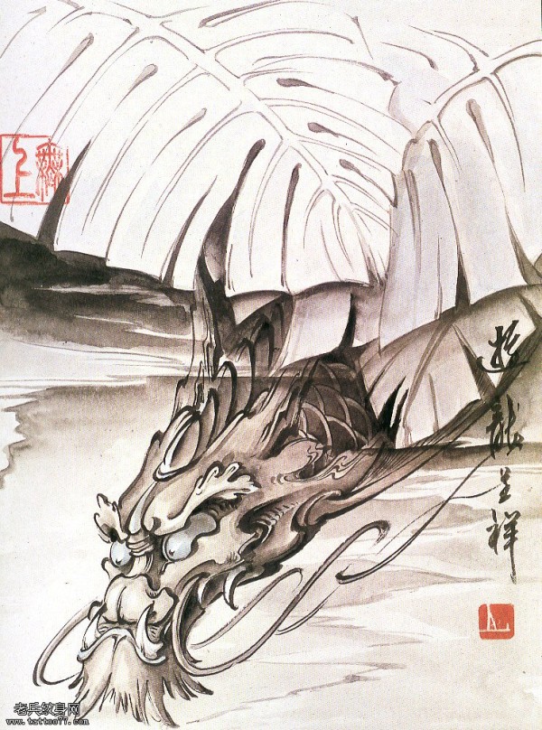 龙纹身手稿_一组老传统黑灰龙手稿纹身图案