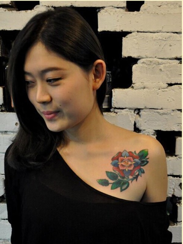 时尚美女肩膀漂亮处彩色花卉纹身作品图片