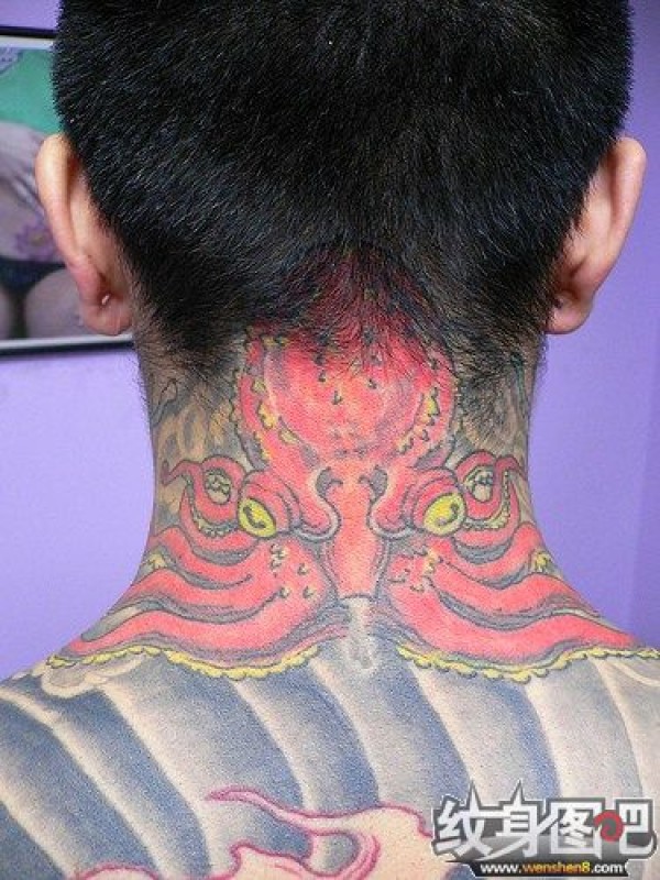 脖子上的红色章鱼纹身