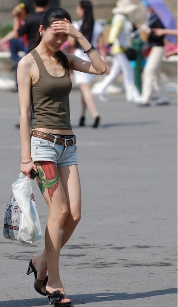 街拍牛仔热裤美少妇腿上有纹身图片图片