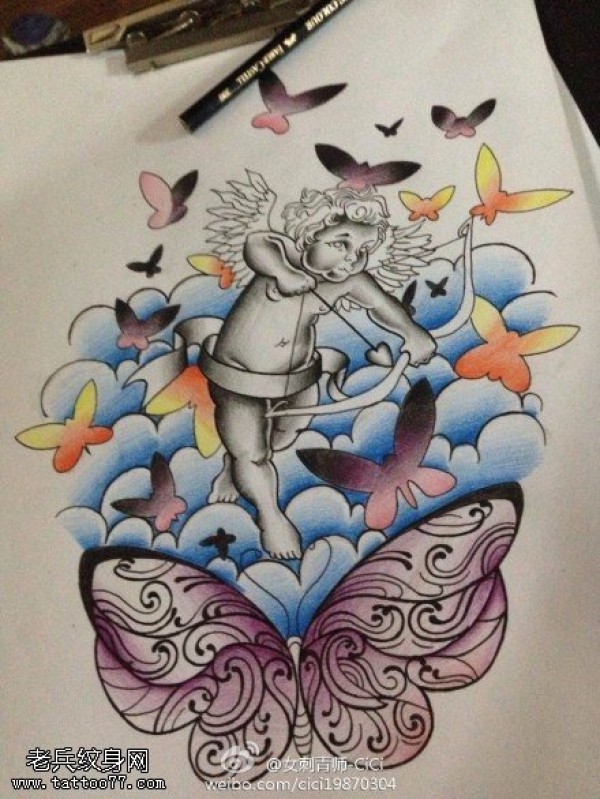 彩色天使蝴蝶纹身手稿图案