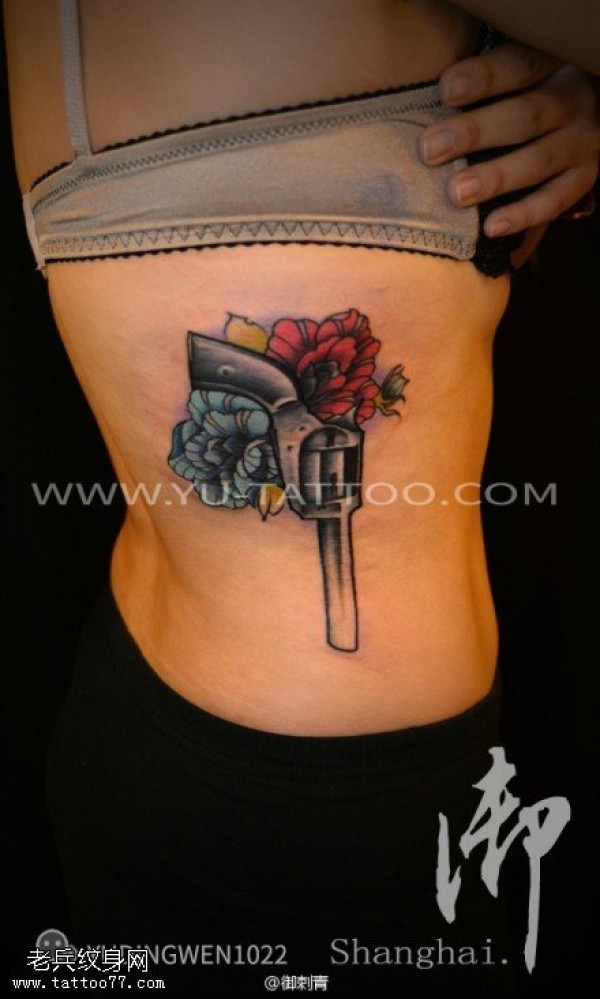 女生侧腰玫瑰花手枪纹身图案
