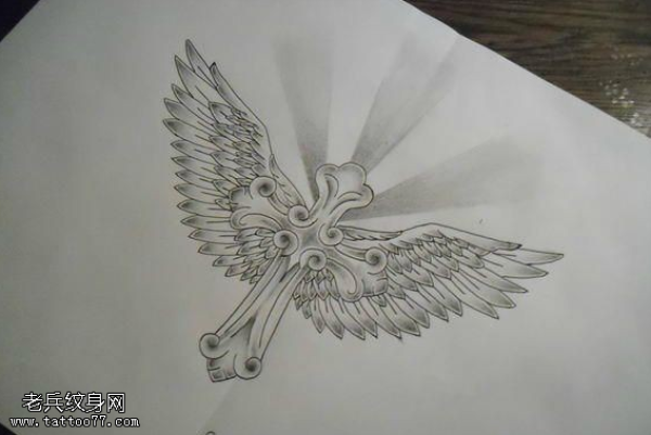 个性十字架翅膀纹身手稿图案