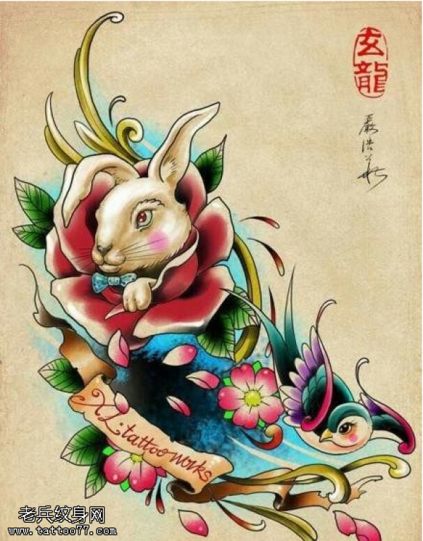 彩色school风格兔子燕子纹身手稿图片