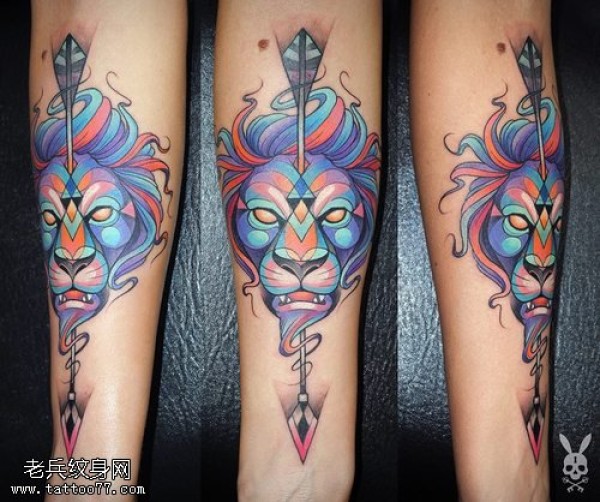 手臂彩色个性狮子头纹身图片