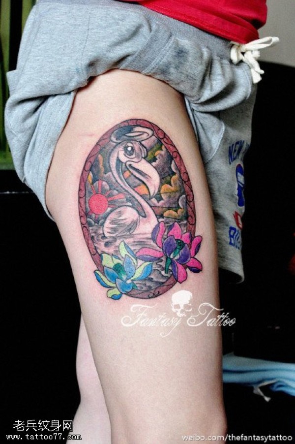 女生腿部彩色天鹅莲花纹身图案