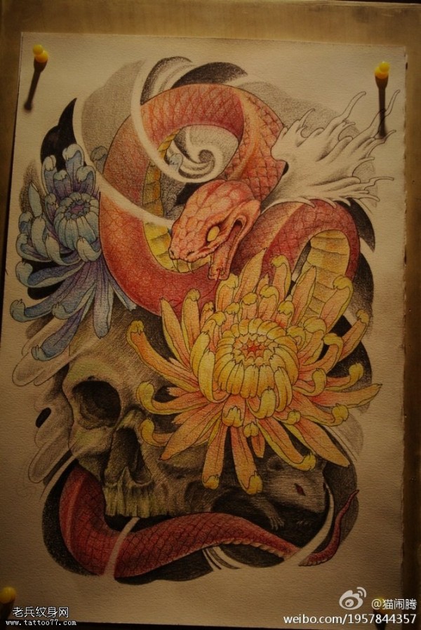 彩色传统骷髅蛇牡丹花纹身手稿图片