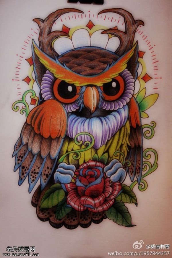 彩色school风格猫头鹰玫瑰花纹身手稿图片