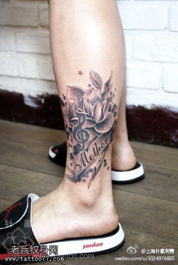 腿部玫瑰花音符字母纹身图案