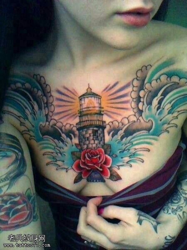 女生胸口个性彩色灯塔纹身图案