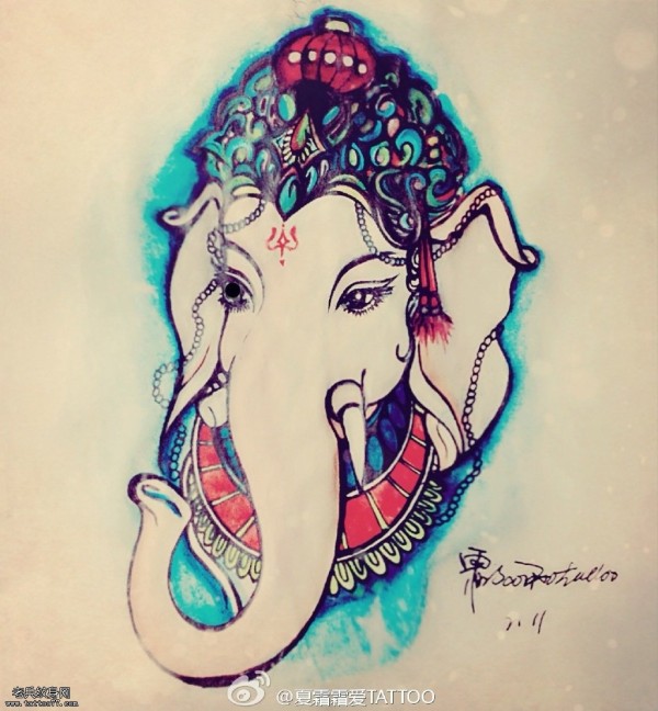 彩色宗教象神纹身手稿图片
