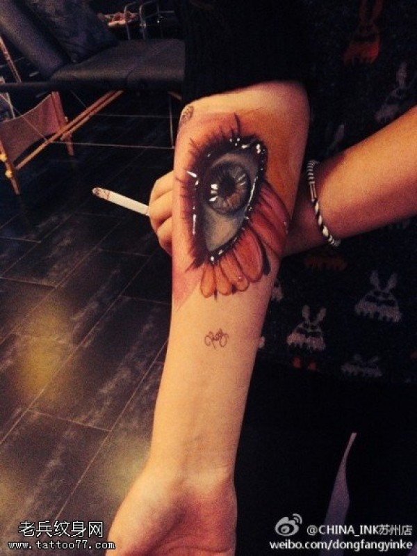 女生手臂彩色写实眼睛纹身图案