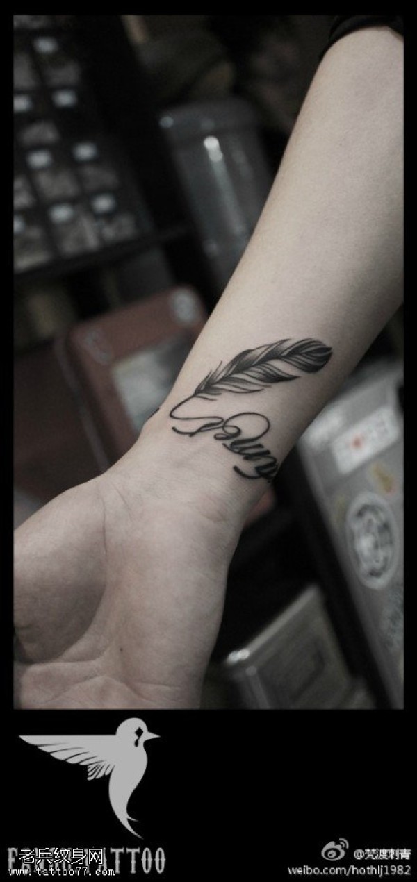 手腕羽毛字母纹身图案