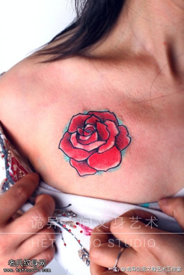 巨乳美女胸口上的性感玫瑰纹身图案