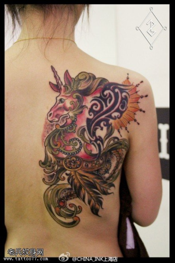 女生背部彩色独角兽纹身图案