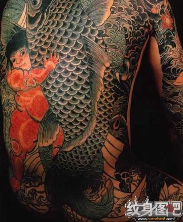 背部红娃娃抱着黑色的大鲤鱼纹身