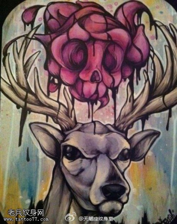 彩色个性羚羊骷髅纹身手稿图案