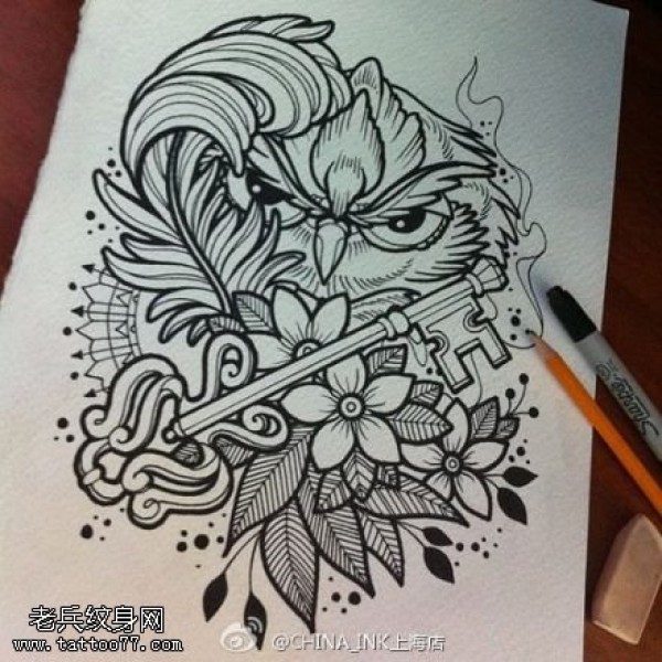 黑灰素描猫头鹰钥匙玫瑰纹身图片