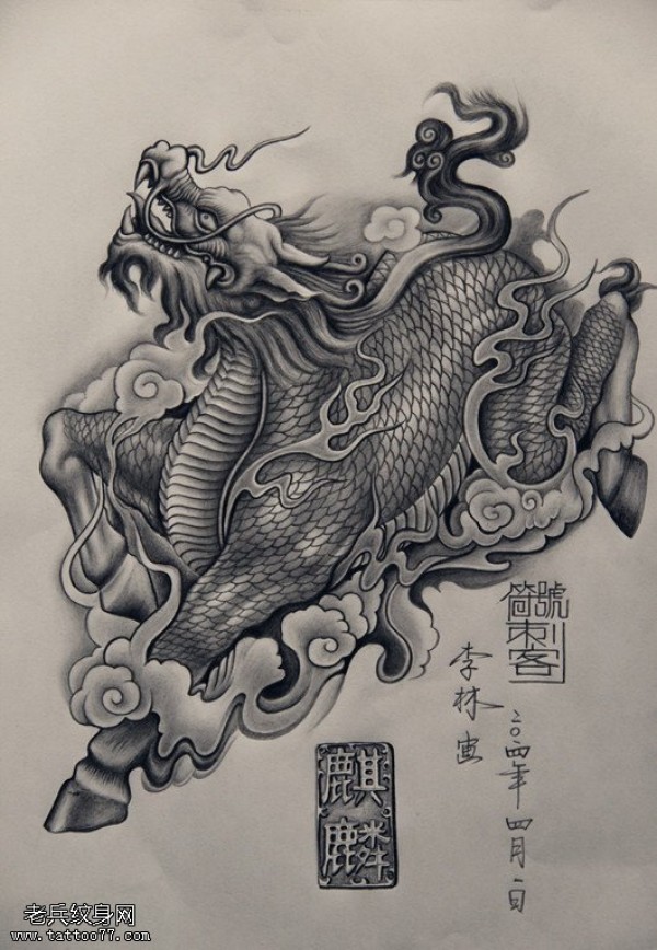 龙纹身手稿_一组老传统黑灰龙手稿纹身图案