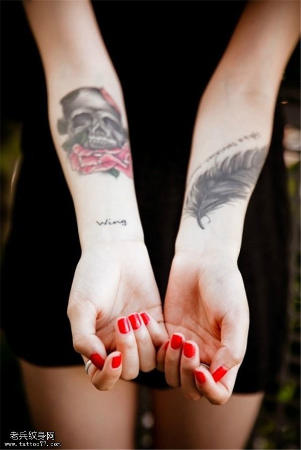 手臂骷髅玫瑰羽毛纹身图案