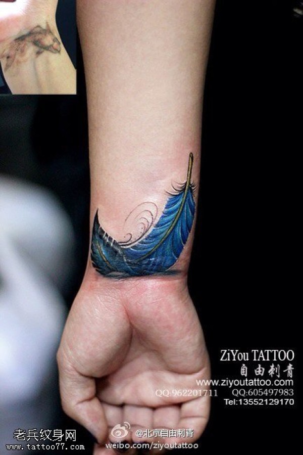 手腕彩色羽毛纹身图案