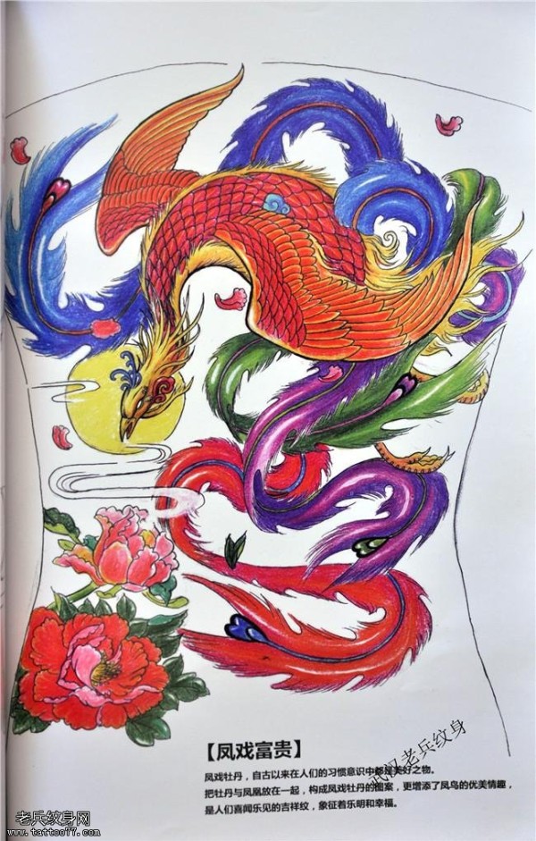 适合满背凤戏富贵凤凰纹身手稿图案