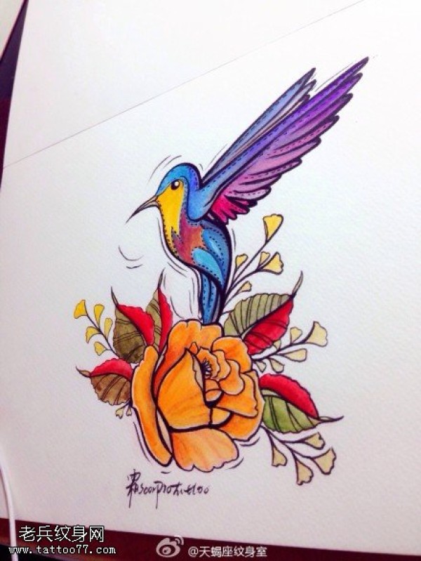 彩色玫瑰花蜂鸟纹身手稿图案