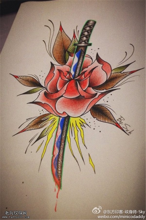 玫瑰花匕首纹身手稿图案