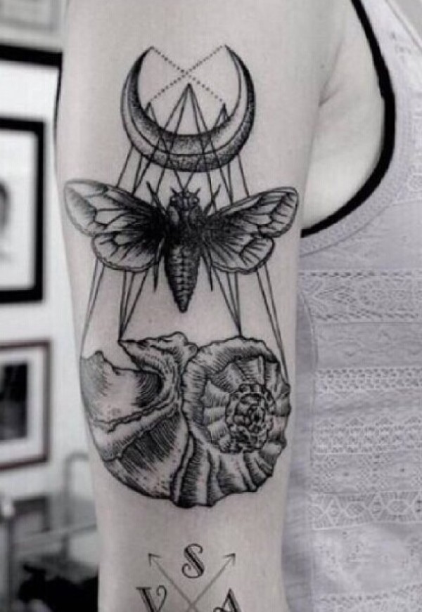 男人大臂黑白彼岸花骷髅_黑白纹身图案大全_纹身图吧