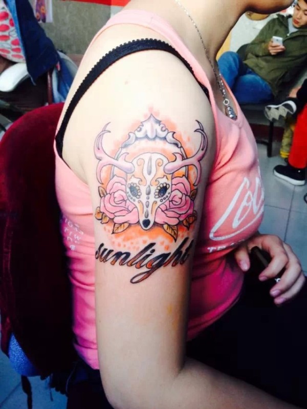 大臂上非常漂亮的藏羚羊英文纹身