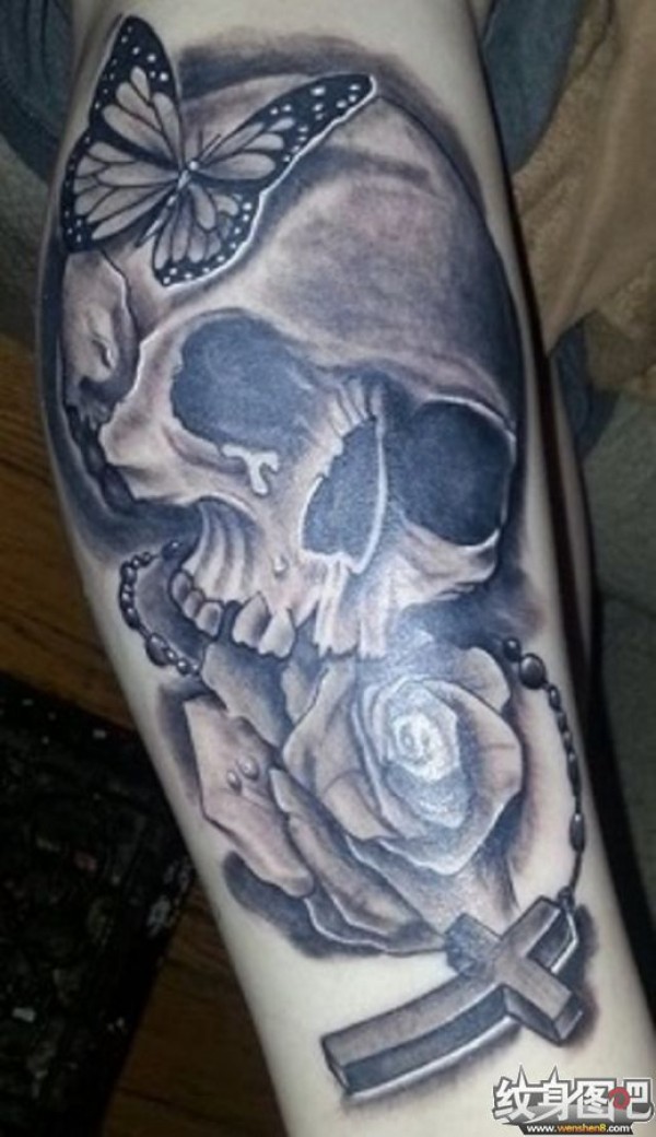 男人大臂黑白彼岸花骷髅_黑白纹身图案大全_纹身图吧