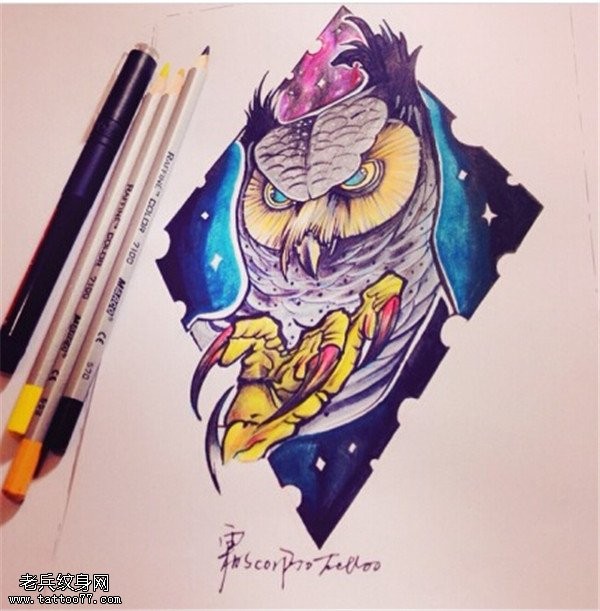彩色猫头鹰纹身手稿图案