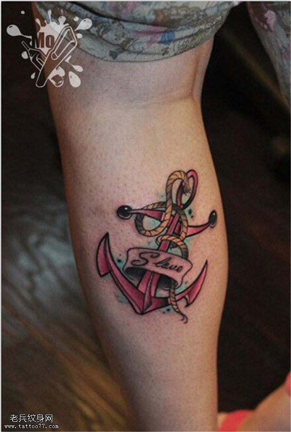 腿部彩色船锚字母纹身图案