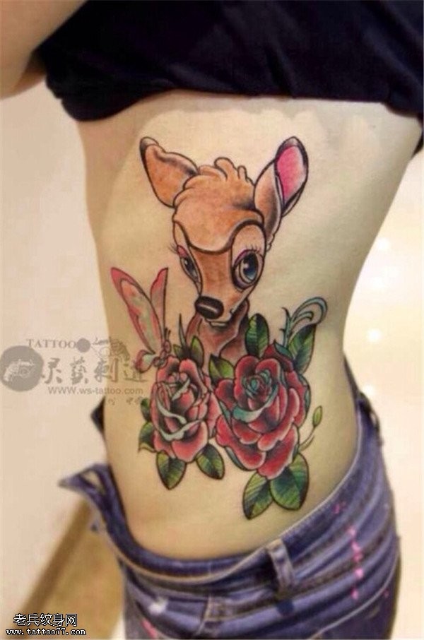 侧腰彩色玫瑰花鹿纹身图案